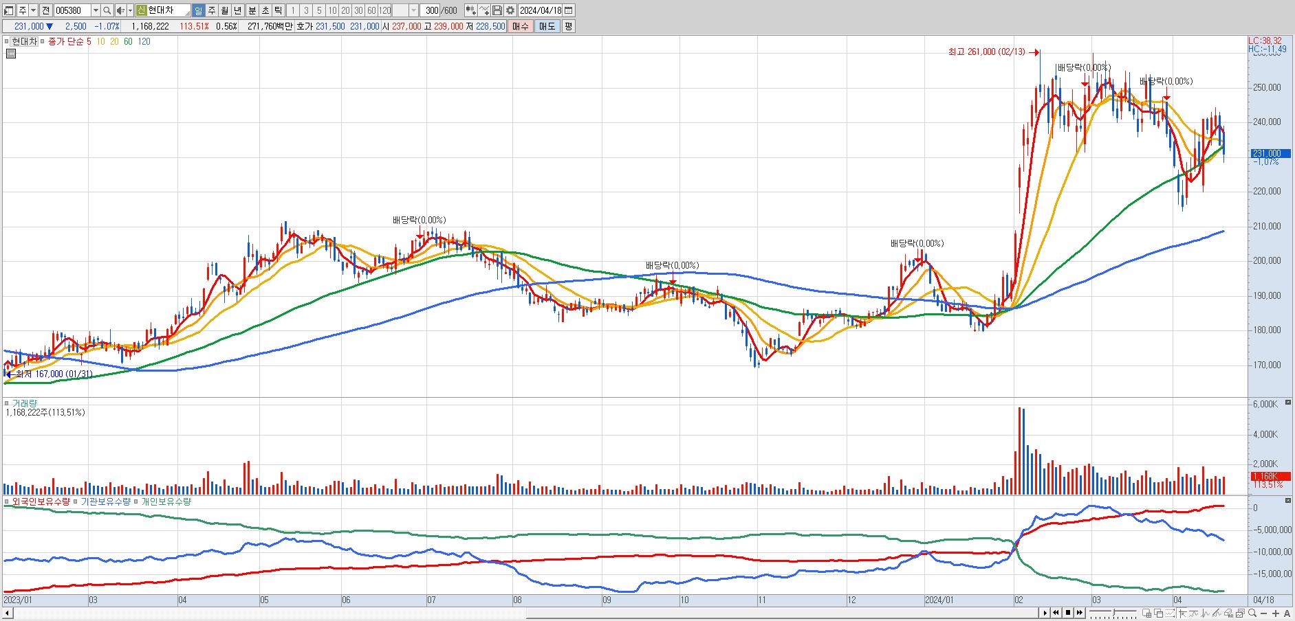 - 현대차 (231,000원 ▼ -1.07% , 시총: 483,751억, 거래량: 1,162,253, 거래대금:2,704억)