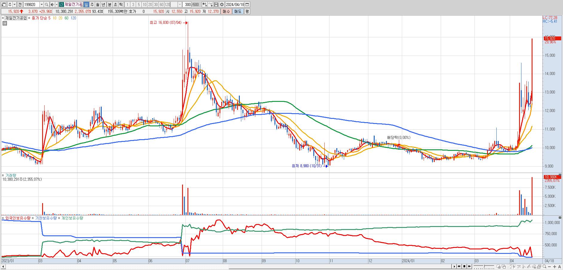- 제일전기공업 (15,920원 ▲ 29.96% , 시총: 1,769억, 거래량: 10,183,969, 거래대금:1,523억)