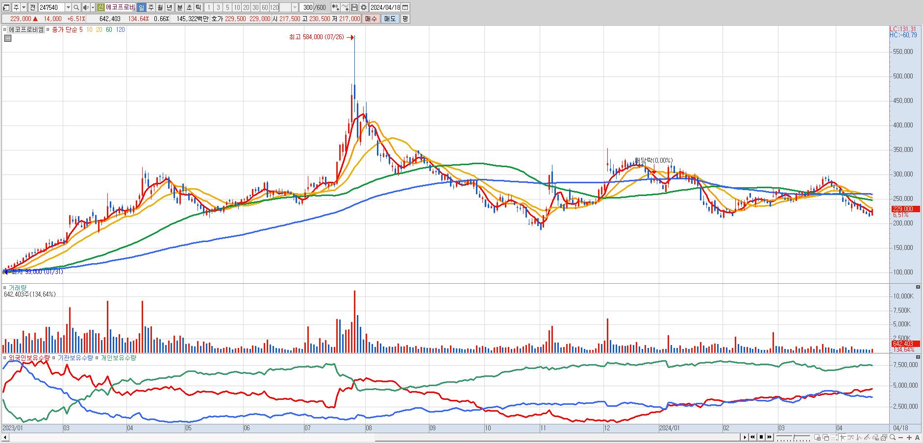 - 에코프로비엠 (229,000원 ▲ 6.51% , 시총: 223,965억, 거래량: 637,963, 거래대금:1,443억)