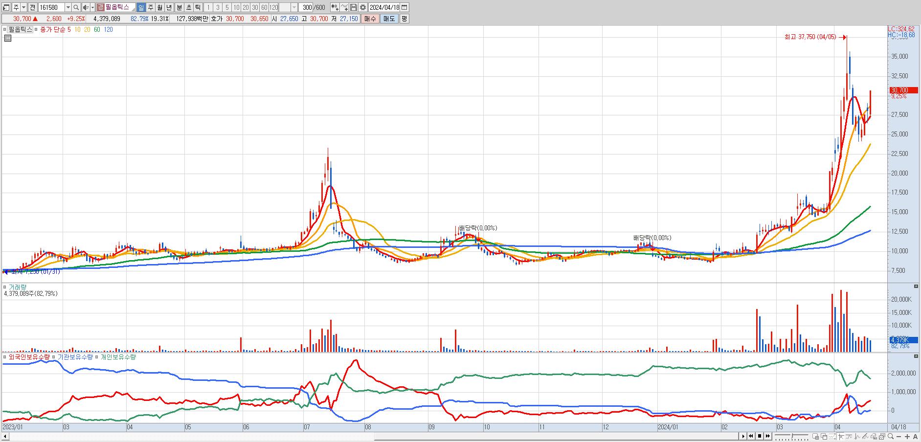 - 필옵틱스 (30,700원 ▲ 9.25% , 시총: 6,962억, 거래량: 4,311,237, 거래대금:1,259억)