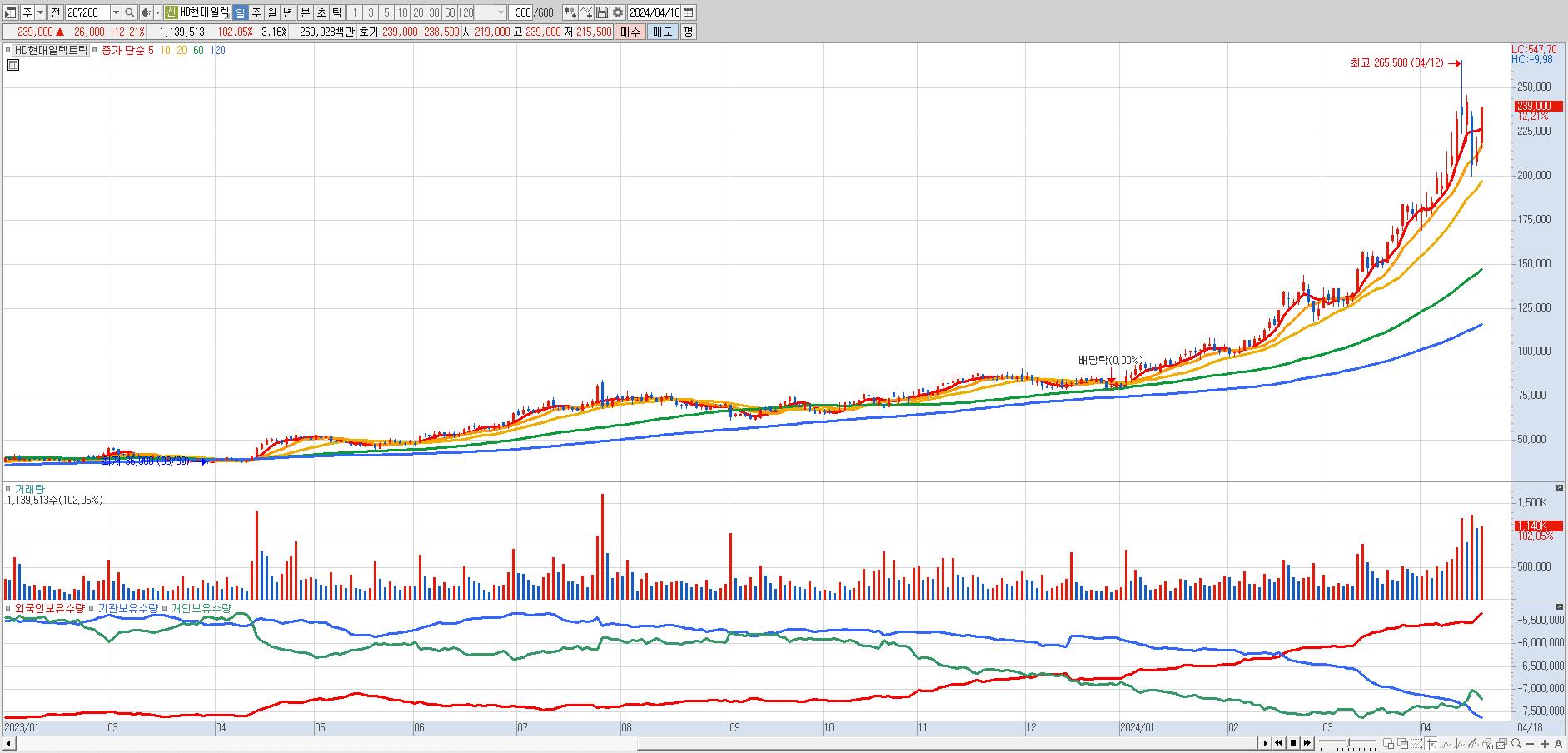 - HD현대일렉트릭 (239,000원 ▲ 12.21% , 시총: 86,153억, 거래량: 1,113,722, 거래대금:2,537억)