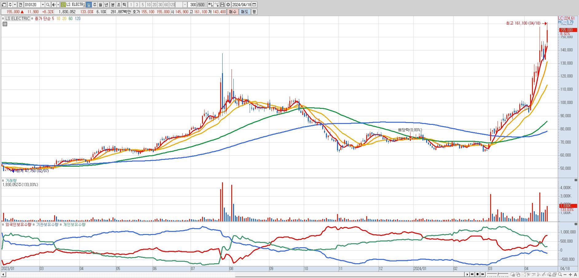 - LS ELECTRIC (155,000원 ▲ 8.32% , 시총: 46,500억, 거래량: 1,814,233, 거래대금:2,794억)