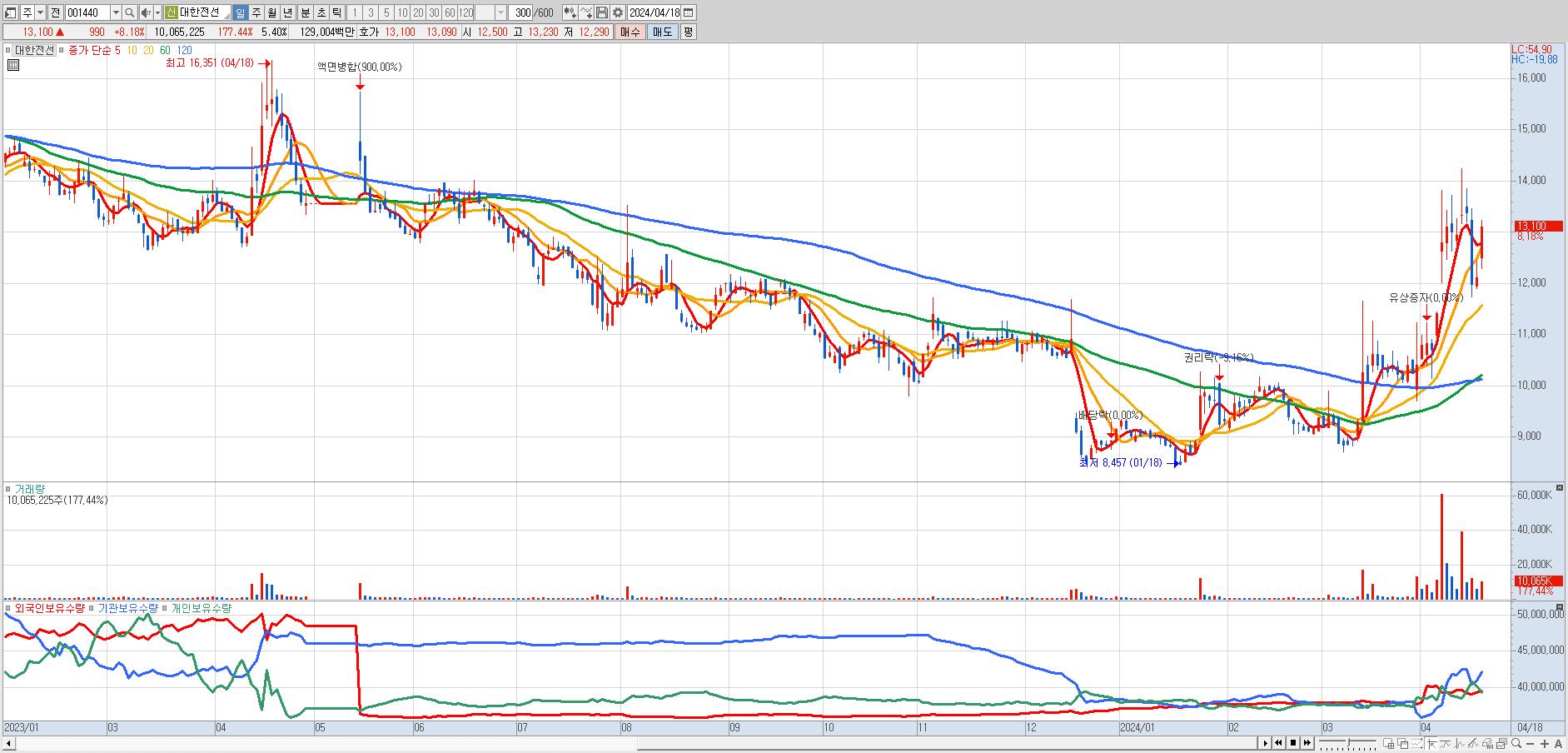 - 대한전선 (13,100원 ▲ 8.18% , 시총: 24,425억, 거래량: 9,902,699, 거래대금:1,269억)
