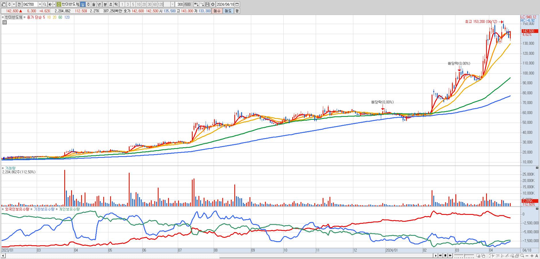 - 한미반도체 (142,600원 ▲ 4.62% , 시총: 138,806억, 거래량: 2,177,309, 거래대금:3,033억)