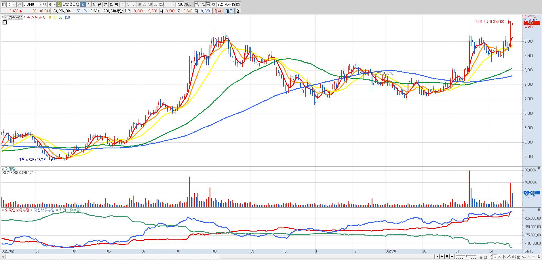 - 삼성중공업 (9,630원 ▲ 0.94% , 시총: 84,744억, 거래량: 23,102,656, 거래대금:2,184억)