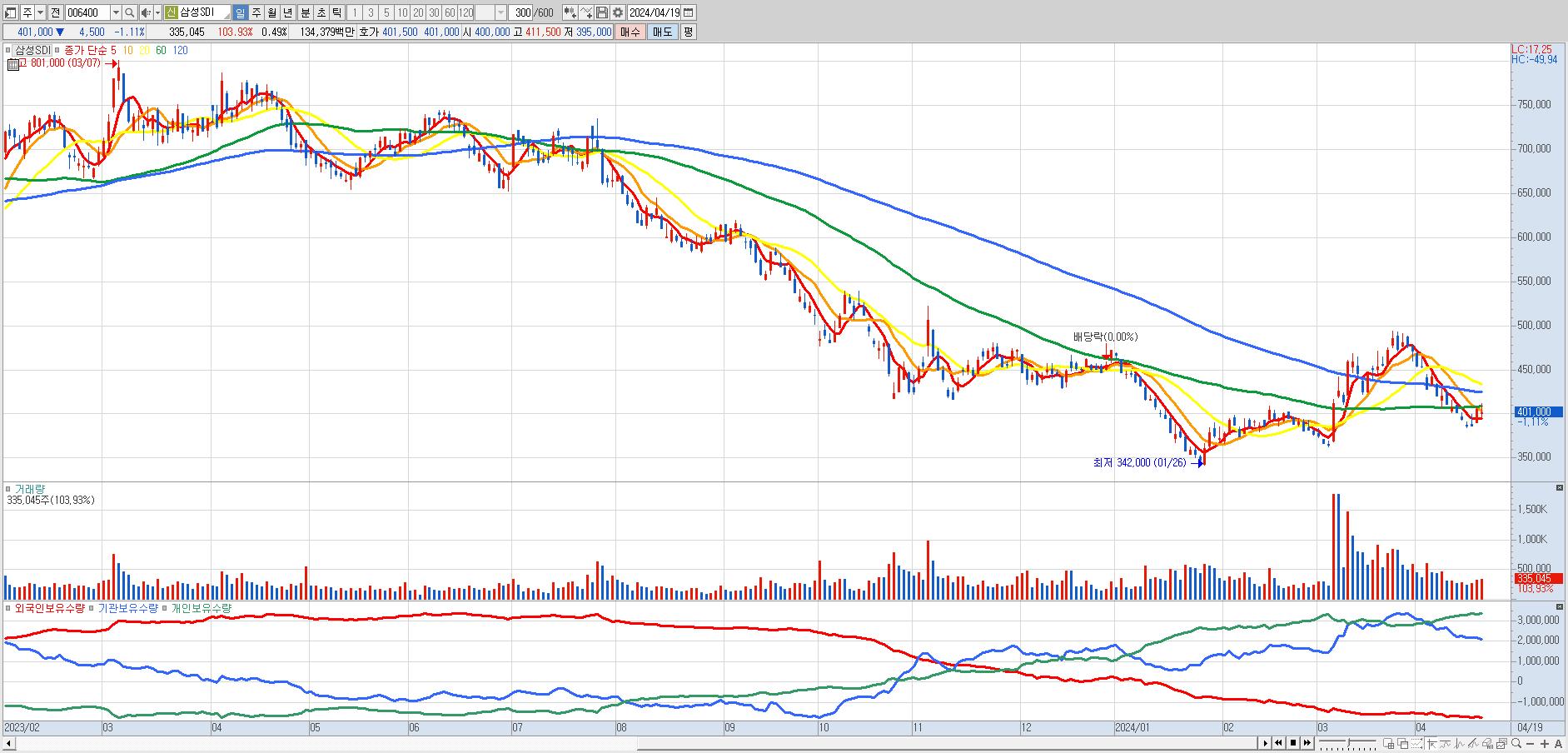 - 삼성SDI (401,000원 ▼ -1.11% , 시총: 275,746억, 거래량: 332,181, 거래대금:1,332억)