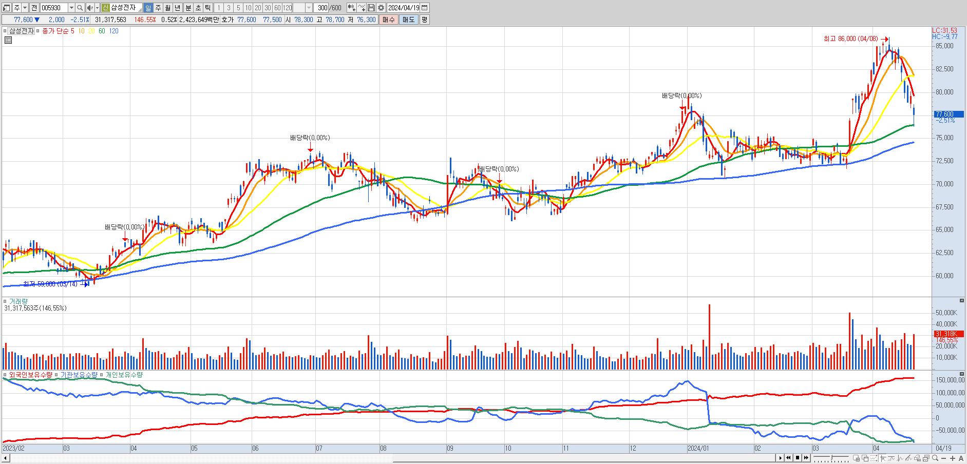 - 삼성전자 (77,600원 ▼ -2.51% , 시총: 4,632,551억, 거래량: 31,211,644, 거래대금:24,154억)