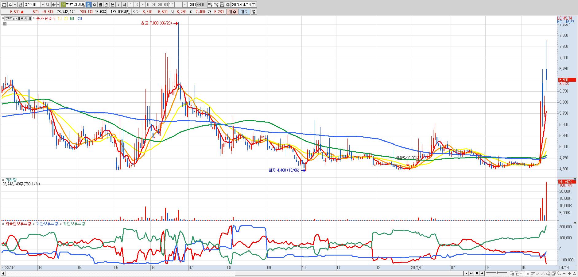 - 한컴라이프케어 (6,500원 ▲ 9.61% , 시총: 1,799억, 거래량: 26,467,995, 거래대금:1,854억)