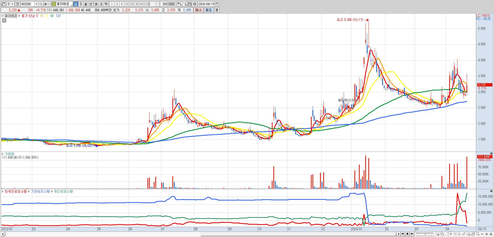 - 흥아해운 (3,220원 ▲ 9.71% , 시총: 7,742억, 거래량: 110,814,822, 거래대금:3,658억)