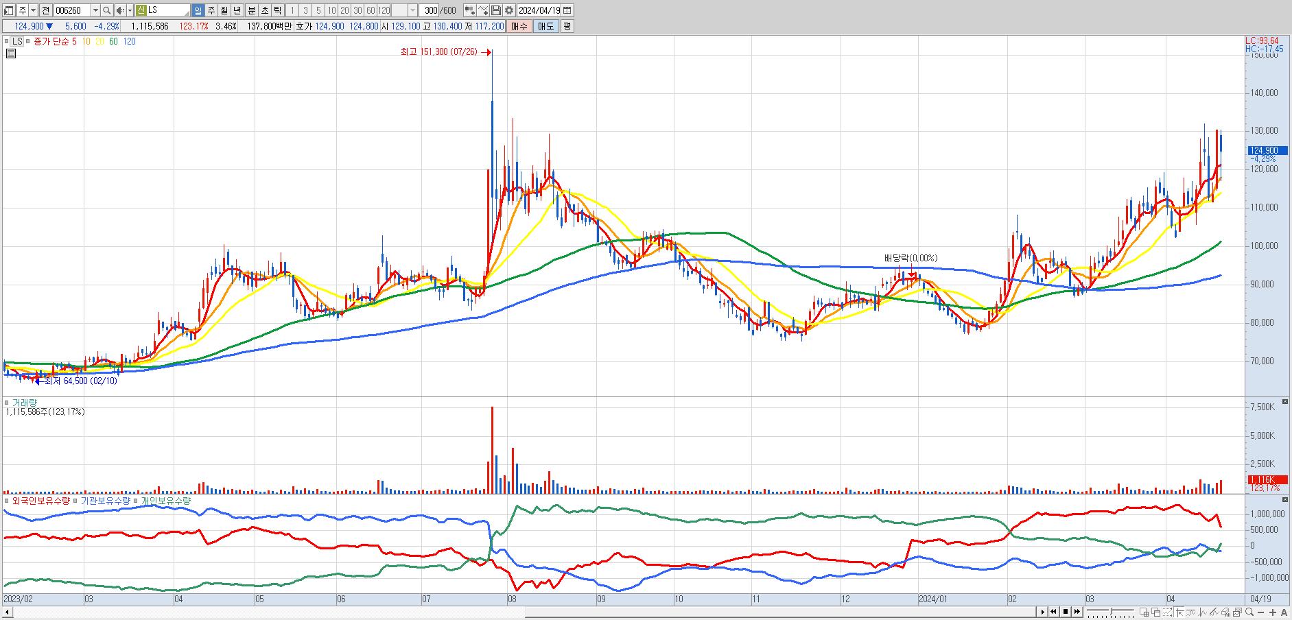 - LS (124,900원 ▼ -4.29% , 시총: 40,218억, 거래량: 1,108,764, 거래대금:1,369억)