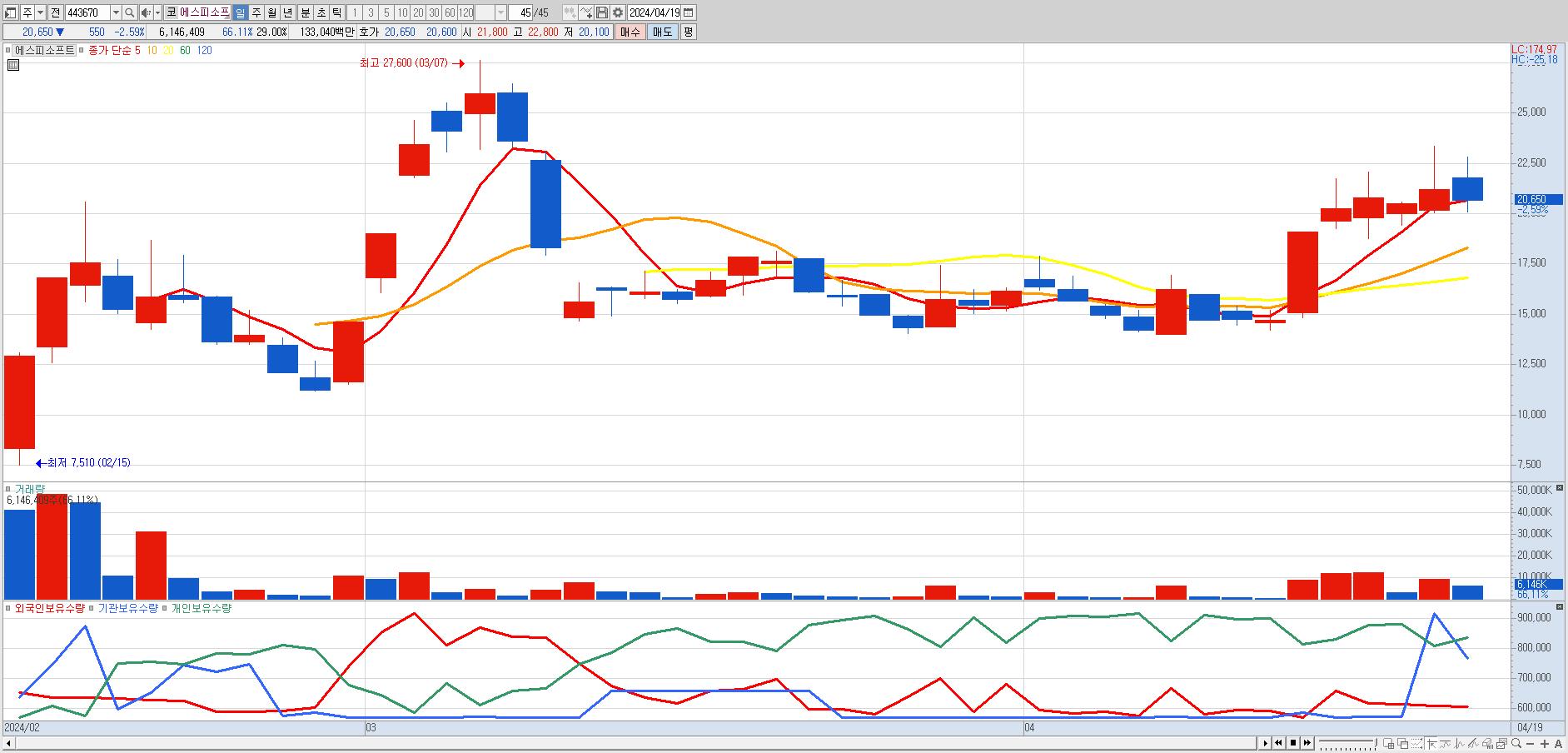 - 에스피소프트 (20,650원 ▼ -2.59% , 시총: 4,377억, 거래량: 6,087,247, 거래대금:1,318억)