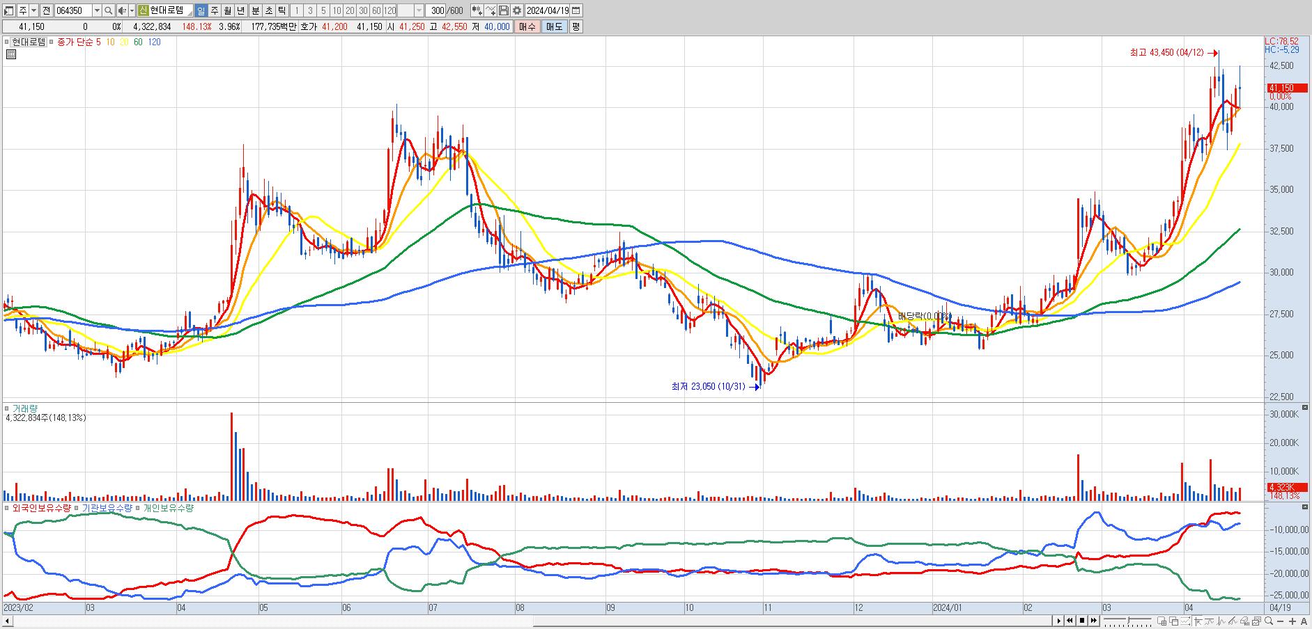 - 현대로템 (41,150원 0% , 시총: 44,912억, 거래량: 4,283,896, 거래대금:1,761억)