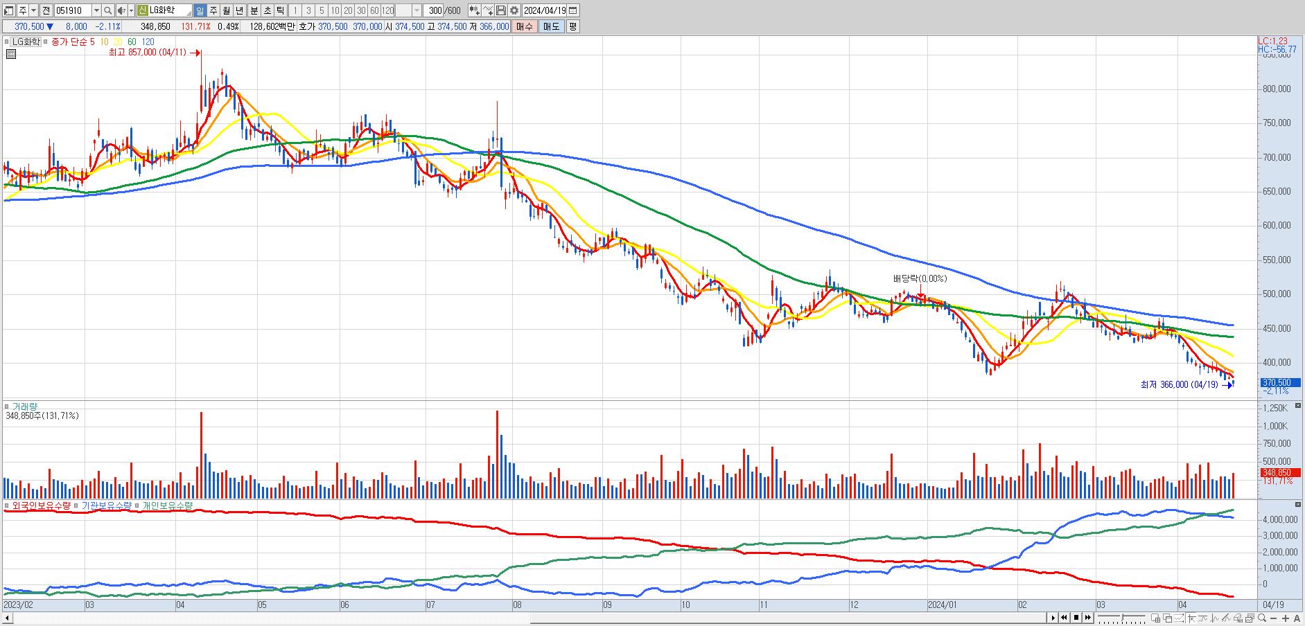 - LG화학 (370,500원 ▼ -2.11% , 시총: 261,545억, 거래량: 346,894, 거래대금:1,279억)