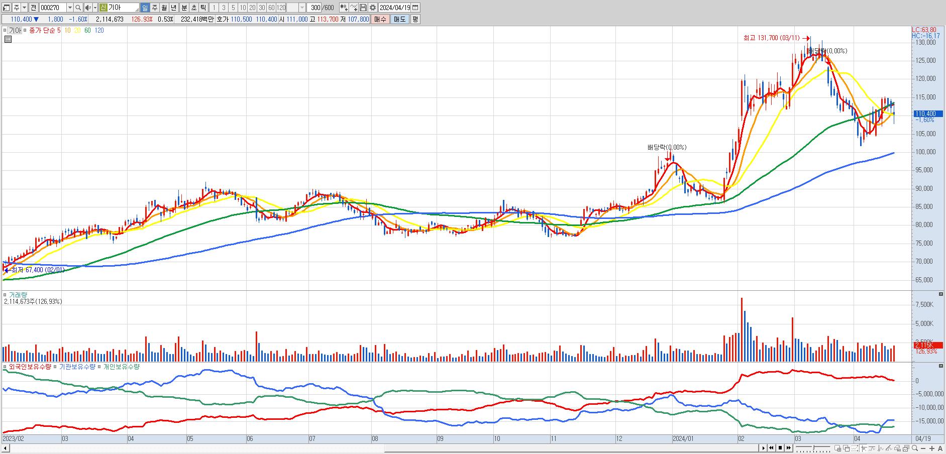 - 기아 (110,400원 ▼ -1.6% , 시총: 443,857억, 거래량: 2,104,768, 거래대금:2,313억)