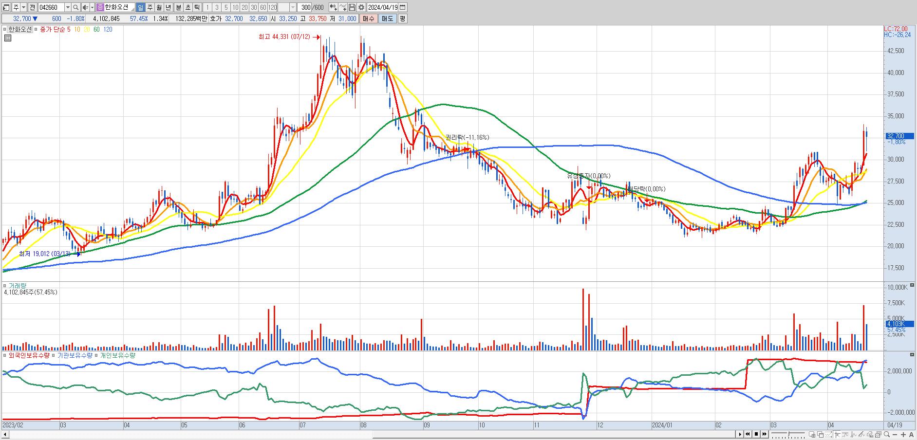 29.한화오션 32,700원 ▼ -1.8% (KOSPI, 042660)