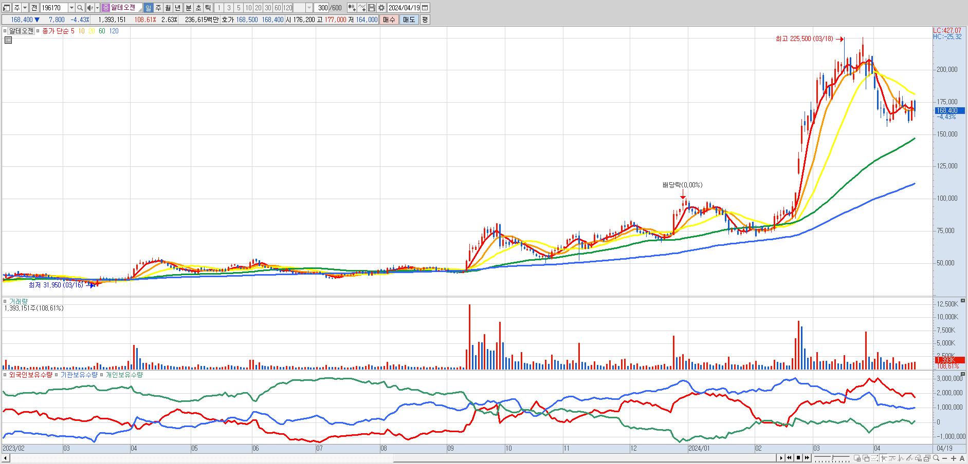 - 알테오젠 (168,400원 ▼ -4.43% , 시총: 89,272억, 거래량: 1,380,170, 거래대금:2,344억)