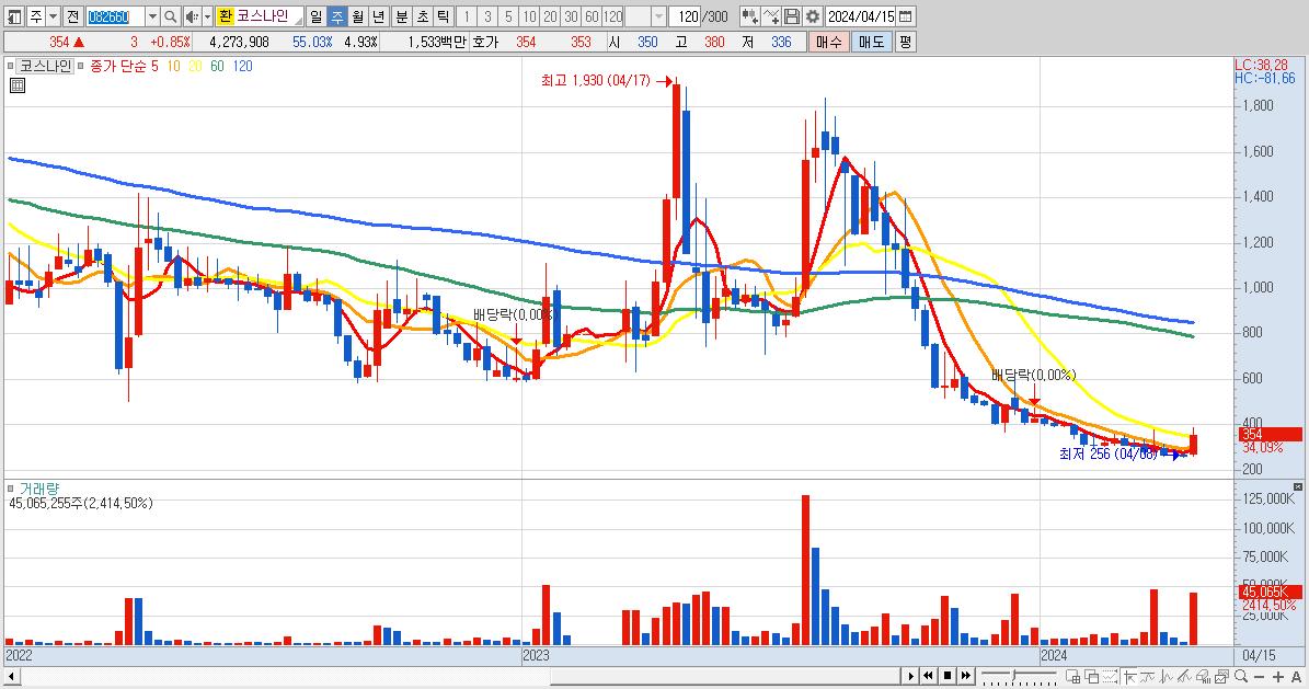 - 코스나인 (354원 ▲ 34.09% , 시총: 307억, 거래량: 45,065,255, 거래대금:146억)