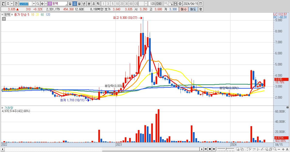 - 윈텍 (3,635원 ▲ 18.79% , 시총: 672억, 거래량: 4,970,514, 거래대금:164억)