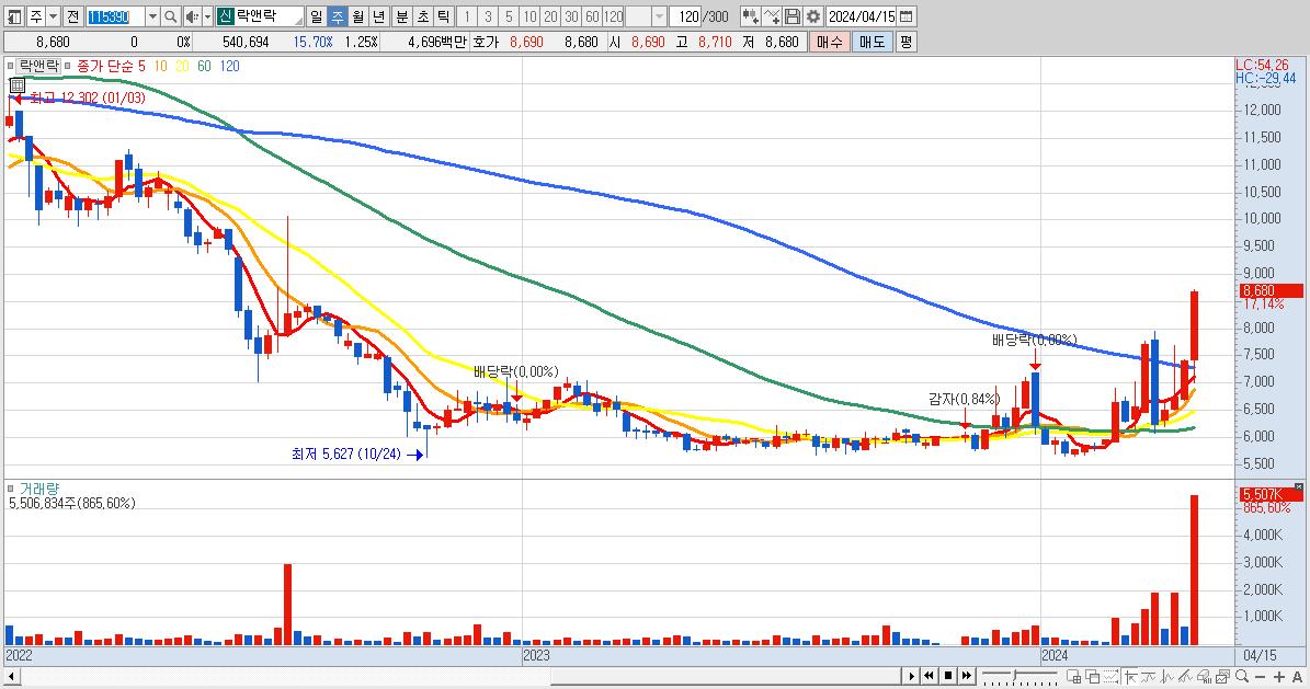 - 락앤락 (8,680원 ▲ 17.14% , 시총: 3,761억, 거래량: 5,506,834, 거래대금:466억)