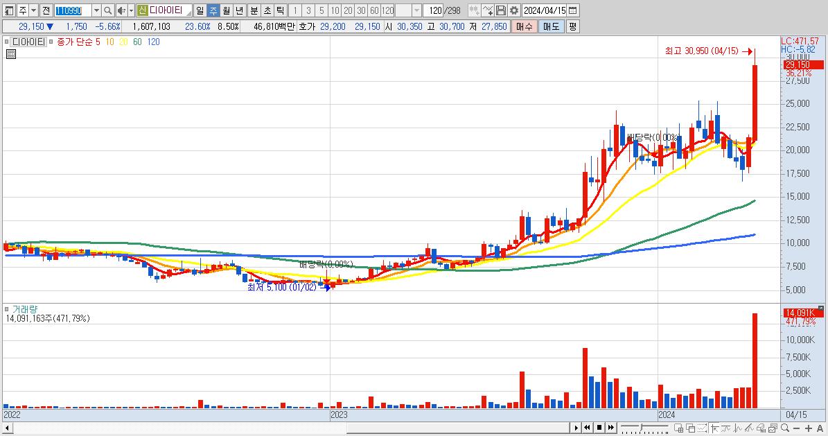 - 디아이티 (29,150원 ▲ 36.21% , 시총: 5,509억, 거래량: 14,091,163, 거래대금:3,947억)
