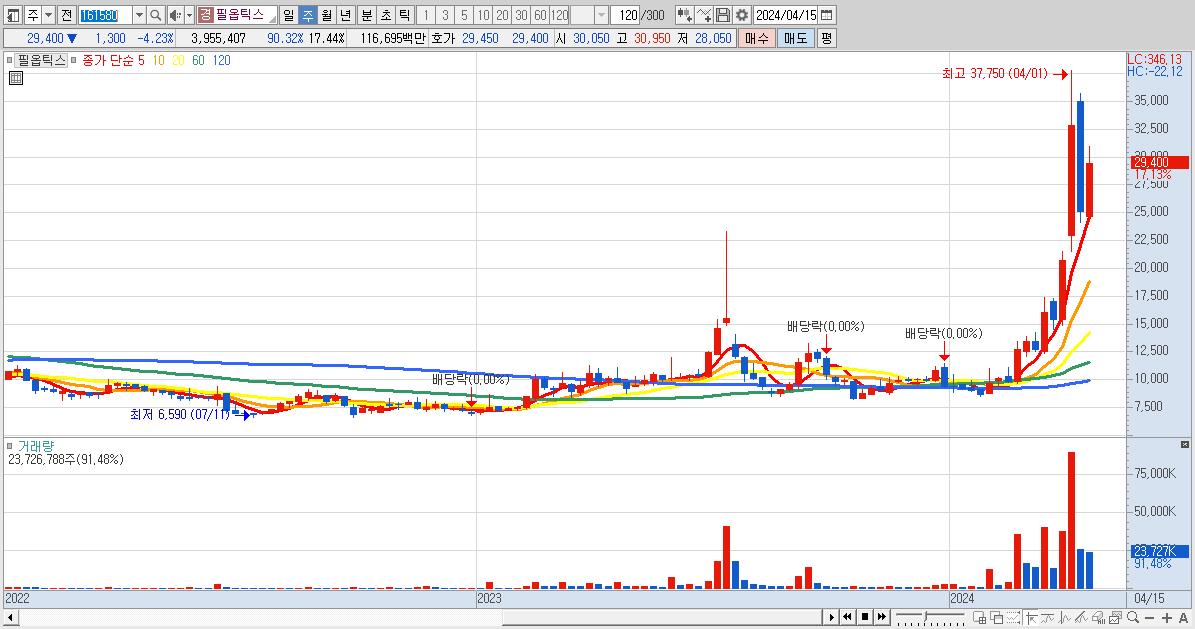 - 필옵틱스 (29,400원 ▲ 17.13% , 시총: 6,667억, 거래량: 23,726,788, 거래대금:6,562억)