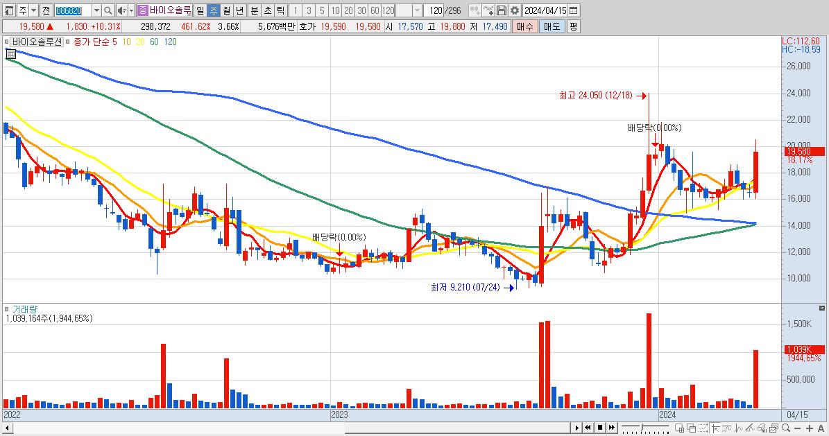 - 바이오솔루션 (19,580원 ▲ 18.17% , 시총: 1,594억, 거래량: 1,039,164, 거래대금:190억)