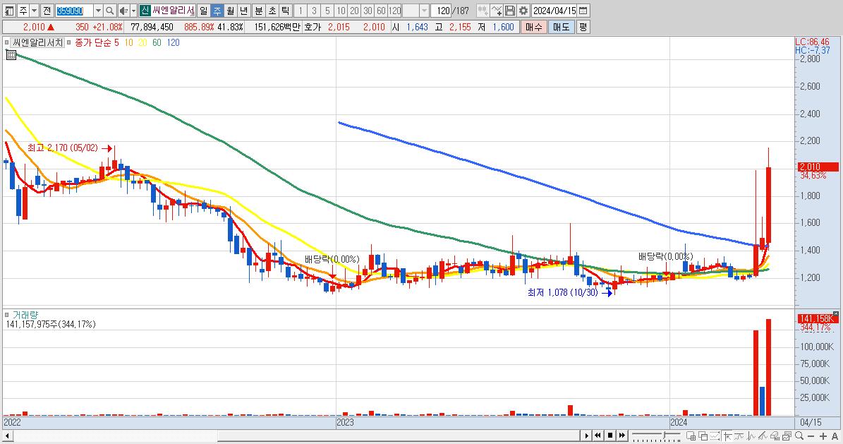 - 씨엔알리서치 (2,010원 ▲ 34.63% , 시총: 1,104억, 거래량: 141,157,975, 거래대금:2,613억)