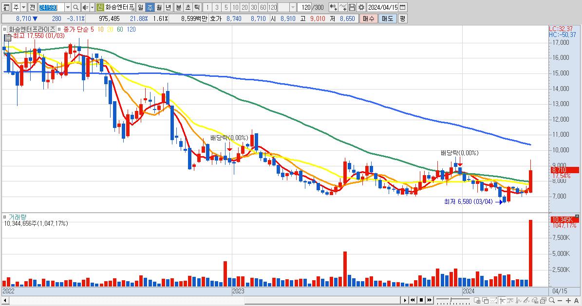 - 화승엔터프라이즈 (8,710원 ▲ 17.54% , 시총: 5,277억, 거래량: 10,344,656, 거래대금:892억)