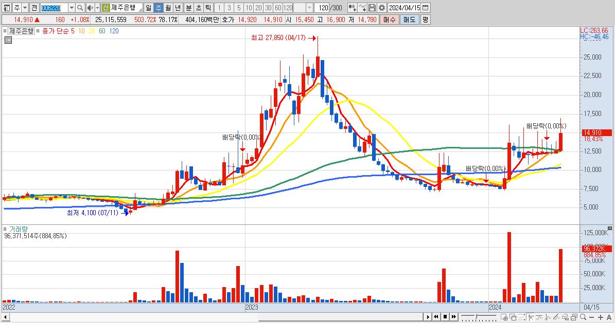 - 제주은행 (14,910원 ▲ 18.43% , 시총: 4,790억, 거래량: 96,371,514, 거래대금:14,578억)