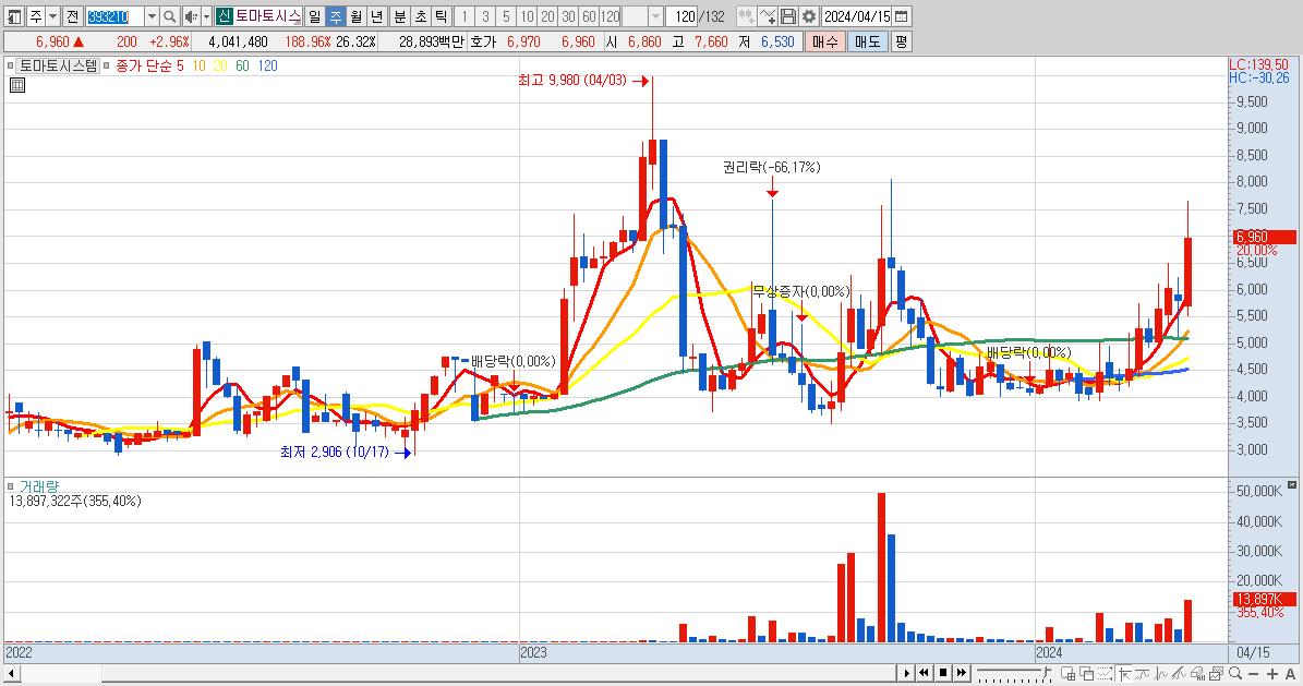 - 토마토시스템 (6,960원 ▲ 20% , 시총: 1,069억, 거래량: 13,897,322, 거래대금:931억)