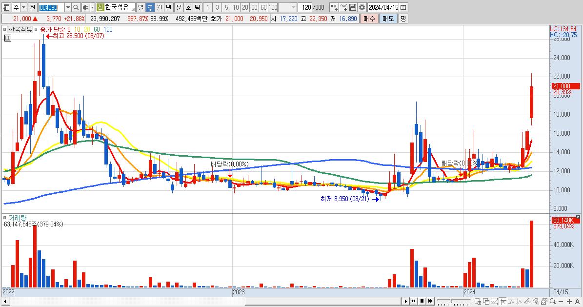 - 한국석유 (21,000원 ▲ 29.39% , 시총: 2,666억, 거래량: 63,147,548, 거래대금:12,672억)
