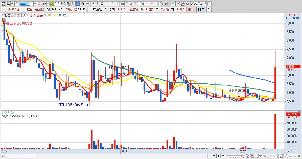 - 한컴라이프케어 (6,500원 ▲ 40.54% , 시총: 1,799억, 거래량: 54,227,754, 거래대금:3,506억)