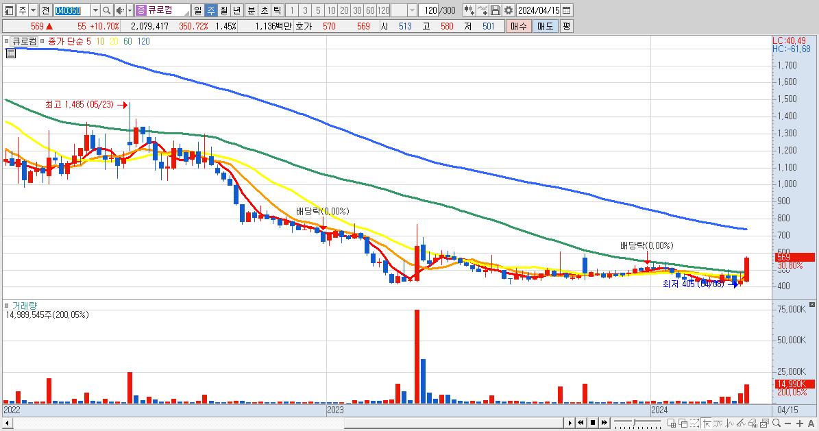 - 큐로컴 (569원 ▲ 30.8% , 시총: 814억, 거래량: 14,989,545, 거래대금:76억)
