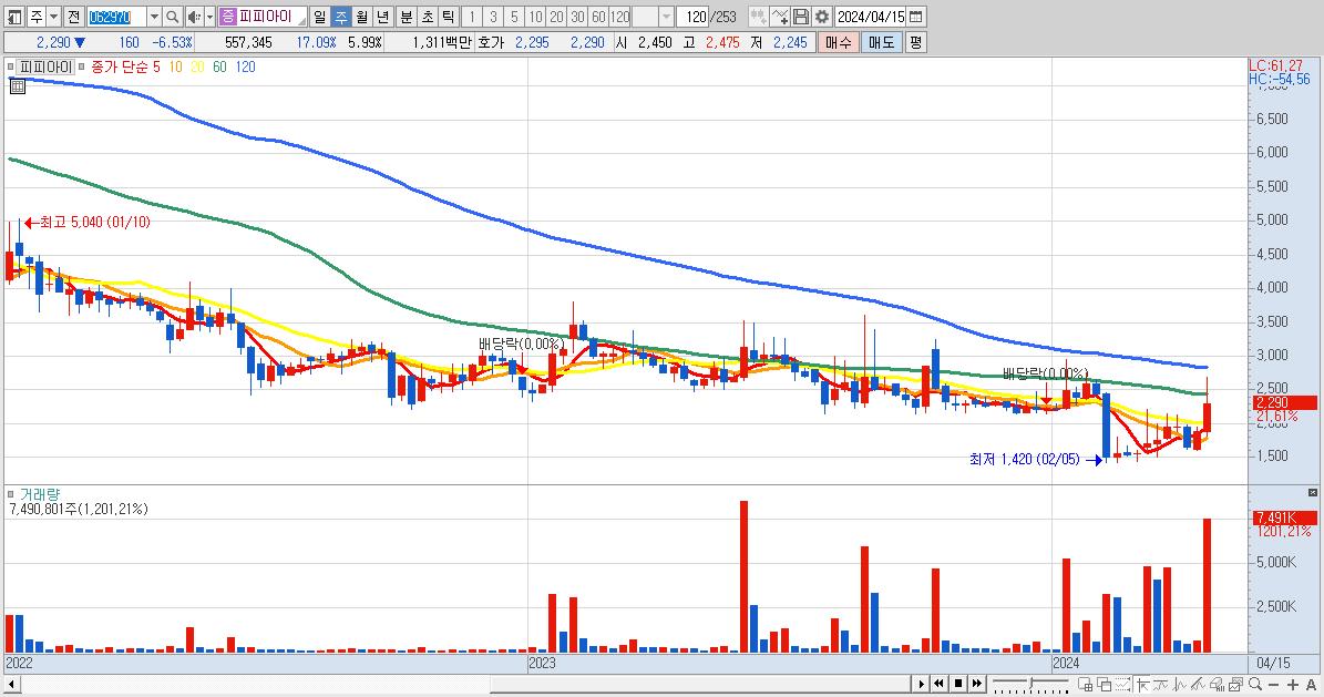 - 피피아이 (2,290원 ▲ 21.61% , 시총: 213억, 거래량: 7,490,801, 거래대금:181억)