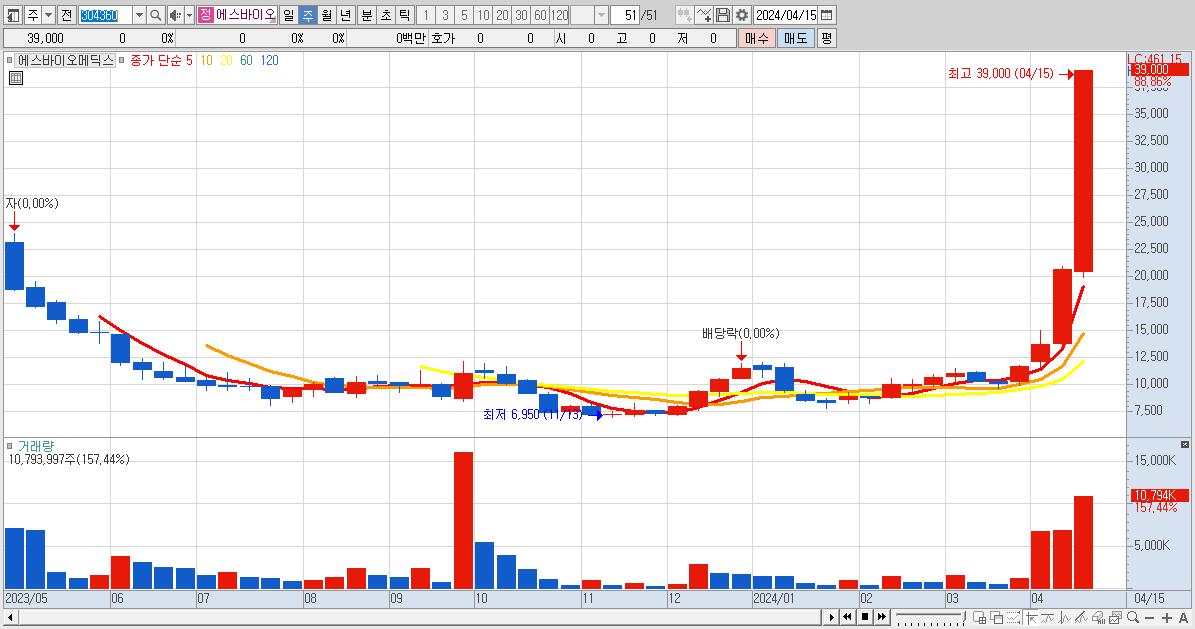 - 에스바이오메딕스 (39,000원 ▲ 88.86% , 시총: 4,446억, 거래량: 10,793,997, 거래대금:2,889억)