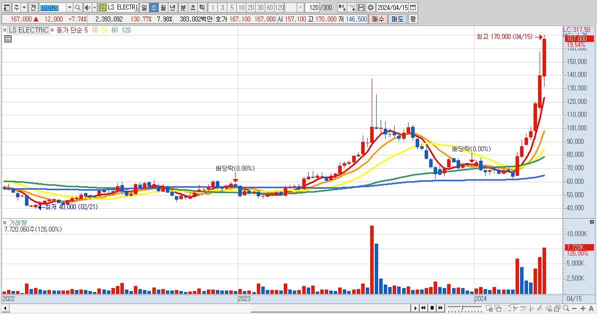 - LS ELECTRIC (167,000원 ▲ 19.54% , 시총: 50,100억, 거래량: 7,720,060, 거래대금:11,545억)
