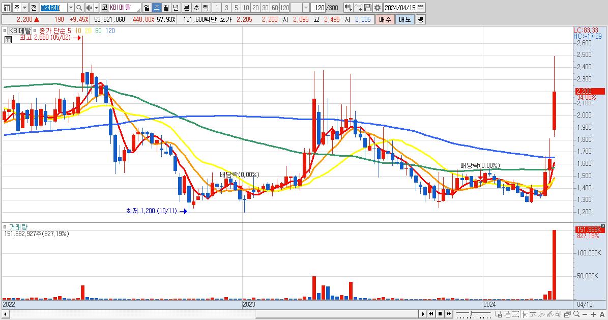 - KBI메탈 (2,200원 ▲ 34.06% , 시총: 747억, 거래량: 151,582,927, 거래대금:3,227억)