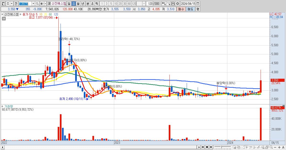 - 신진에스엠 (3,550원 ▲ 20.54% , 시총: 621억, 거래량: 60,677,087, 거래대금:2,280억)