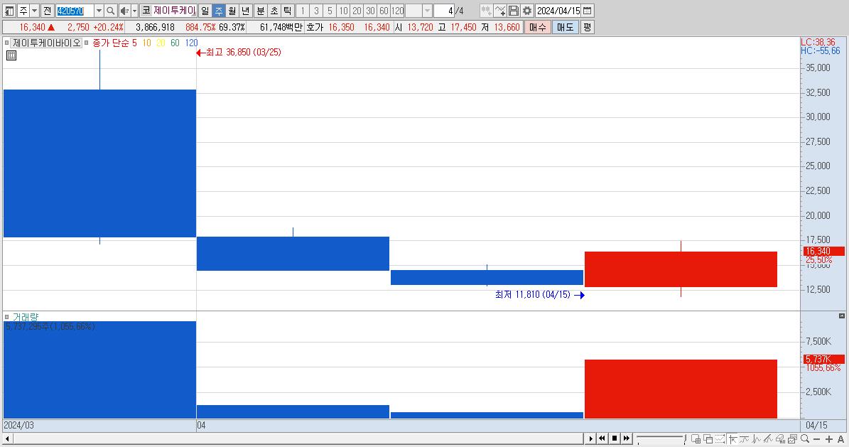 - 제이투케이바이오 (16,340원 ▲ 25.5% , 시총: 911억, 거래량: 5,737,295, 거래대금:879억)