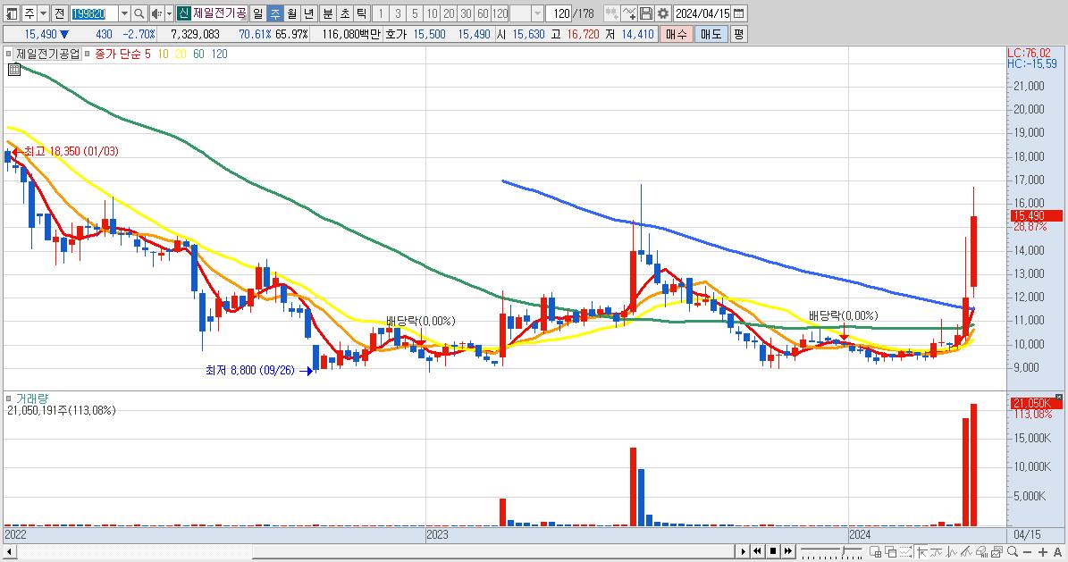 - 제일전기공업 (15,490원 ▲ 28.87% , 시총: 1,721억, 거래량: 21,050,191, 거래대금:3,142억)