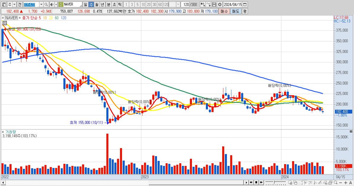 - NAVER (182,400원 ▼ -1.88% , 시총: 296,233억, 거래량: 3,198,149, 거래대금:5,792억)