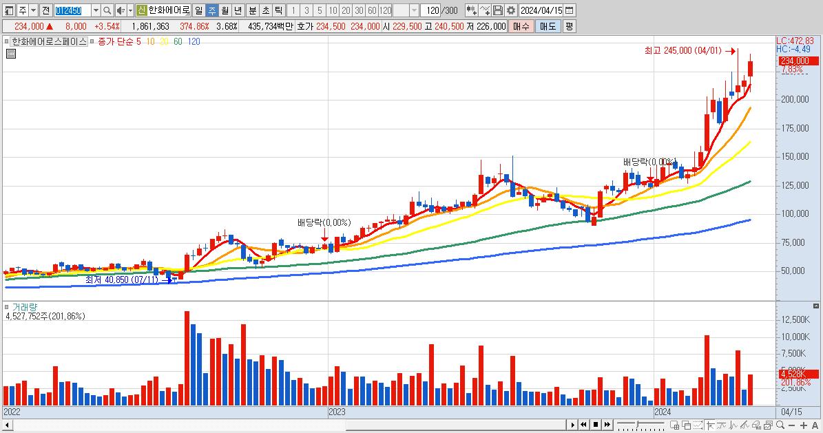 - 한화에어로스페이스 (234,000원 ▲ 7.83% , 시총: 118,474억, 거래량: 4,527,752, 거래대금:10,137억)