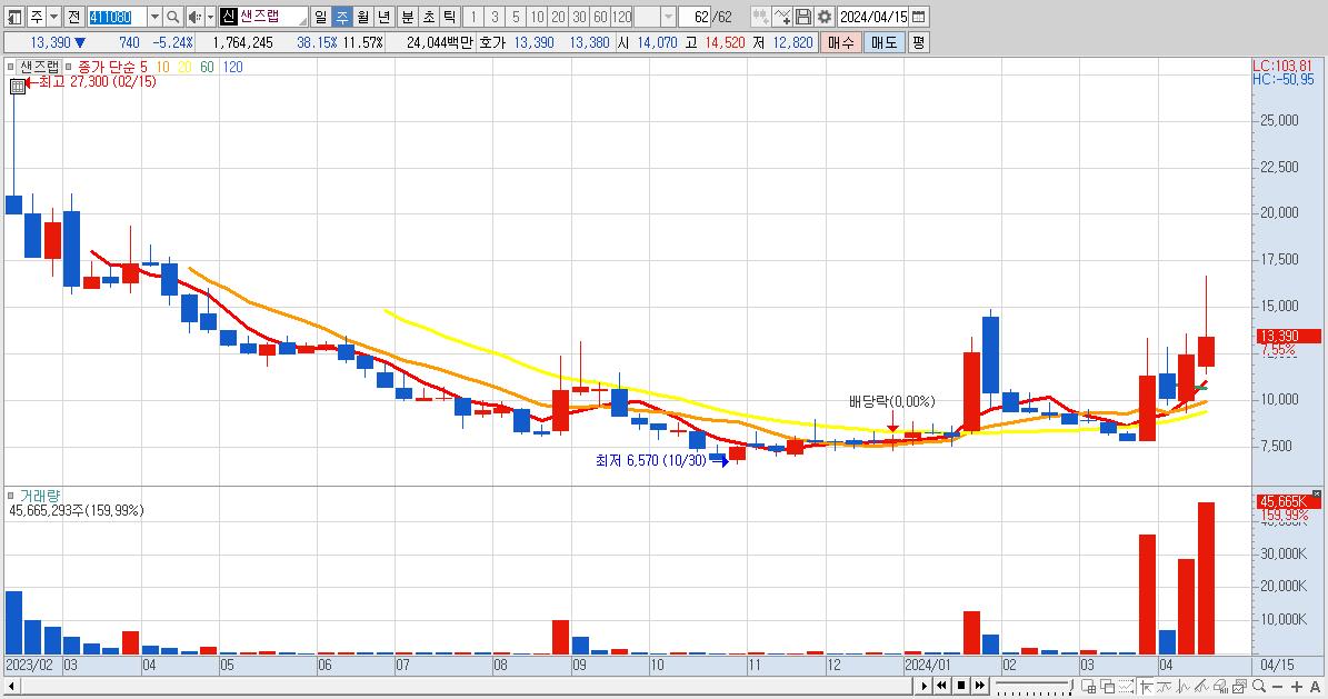- 샌즈랩 (13,390원 ▲ 7.55% , 시총: 2,042억, 거래량: 45,665,293, 거래대금:6,630억)