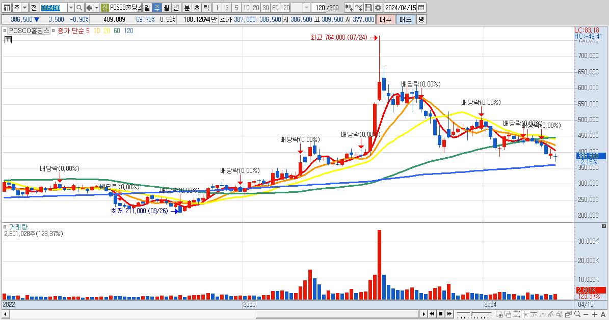 - POSCO홀딩스 (386,500원 ▼ -2.15% , 시총: 326,868억, 거래량: 2,601,028, 거래대금:9,986억)