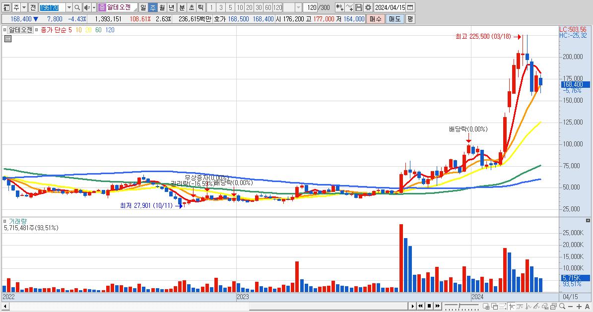 - 알테오젠 (168,400원 ▼ -5.76% , 시총: 89,272억, 거래량: 5,715,481, 거래대금:9,699억)