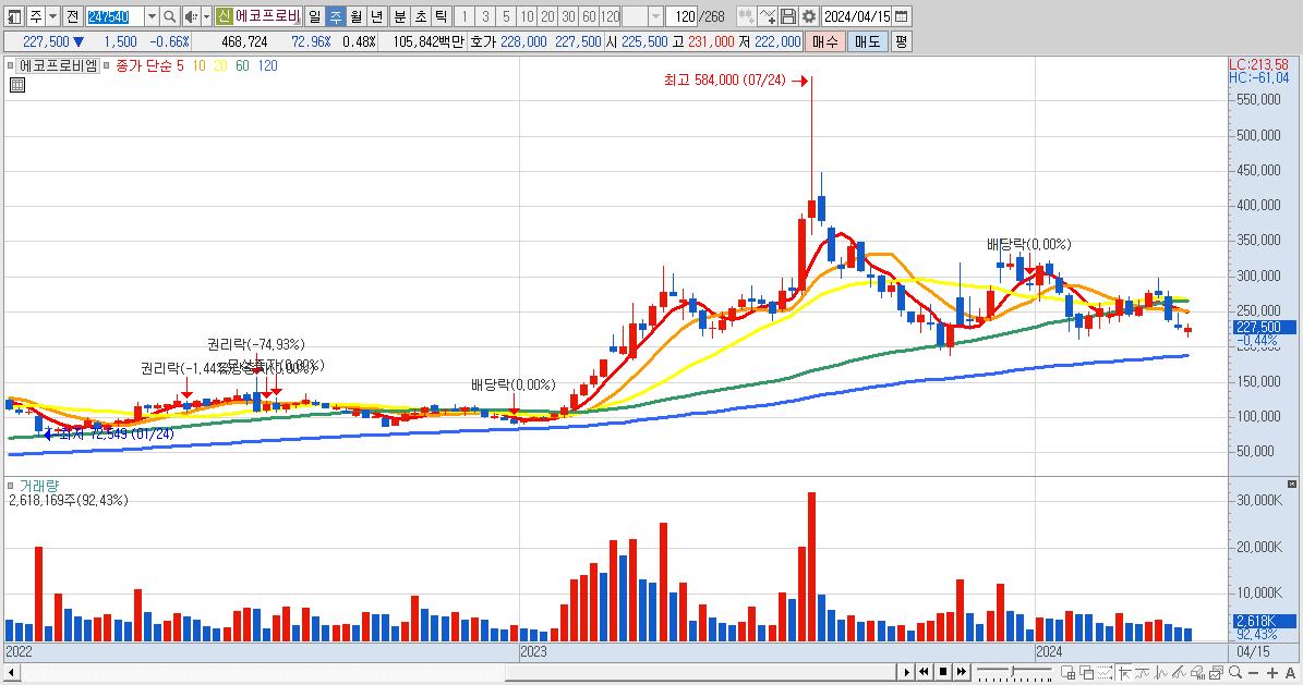- 에코프로비엠 (227,500원 ▼ -0.44% , 시총: 222,498억, 거래량: 2,618,169, 거래대금:5,877억)