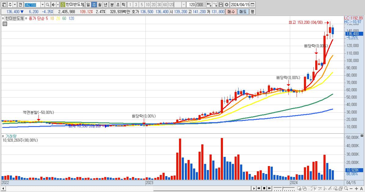 - 한미반도체 (136,400원 ▼ -6.25% , 시총: 132,771억, 거래량: 10,928,269, 거래대금:15,379억)