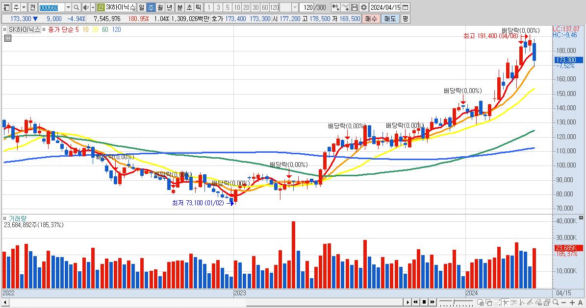 - SK하이닉스 (173,300원 ▼ -7.52% , 시총: 1,261,628억, 거래량: 23,684,892, 거래대금:42,320억)
