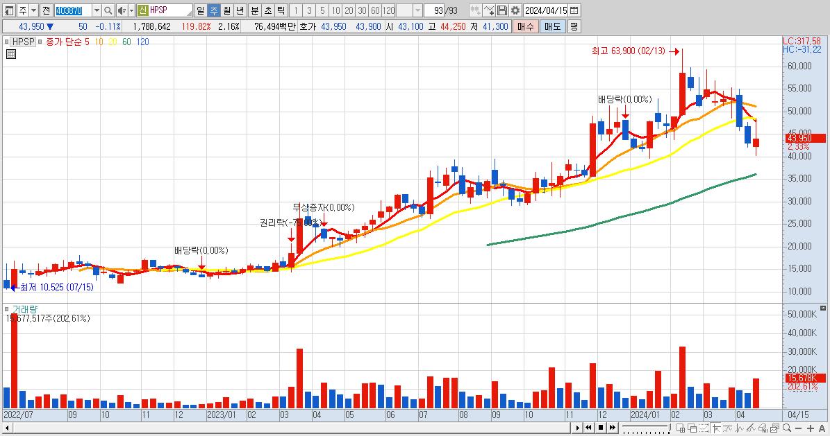 - HPSP (43,950원 ▲ 2.33% , 시총: 36,450억, 거래량: 15,677,517, 거래대금:6,868억)
