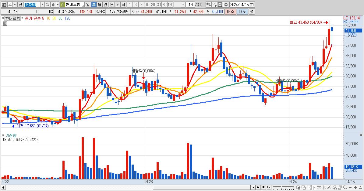 - 현대로템 (41,150원 ▼ -1.08% , 시총: 44,912억, 거래량: 19,781,168, 거래대금:7,907억)